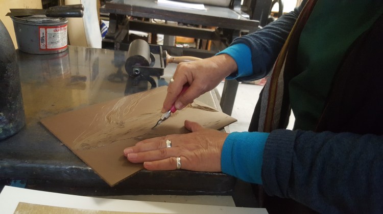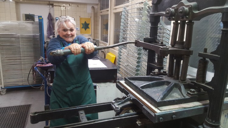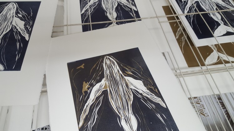 Here I am doing a reduction print of a series of whales, in Berlin in December 2019/January 2020 In the reclaimed building in Kreuzberg, Berlin. You can see the old presses which we worked on, dating from the late 1800’s.